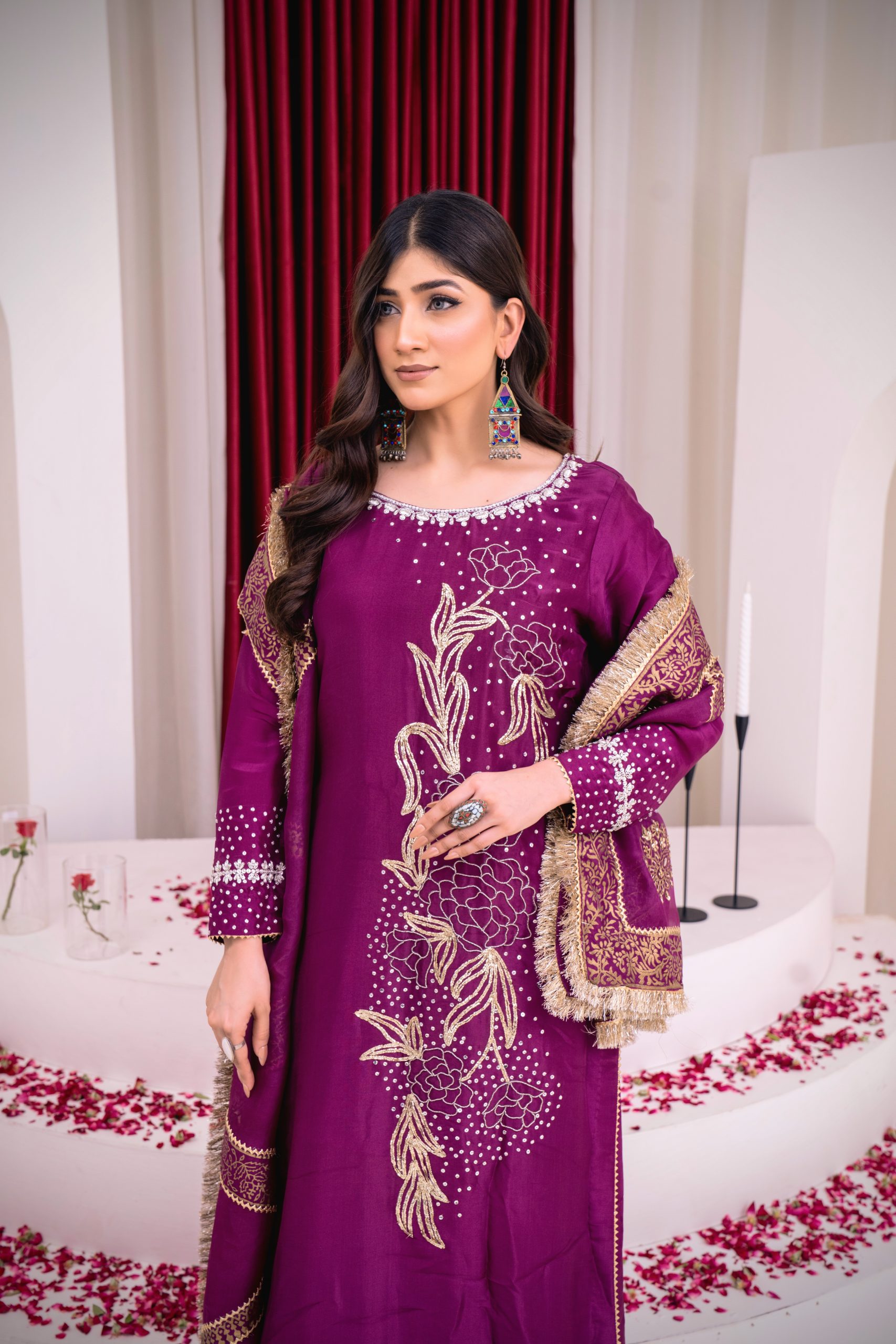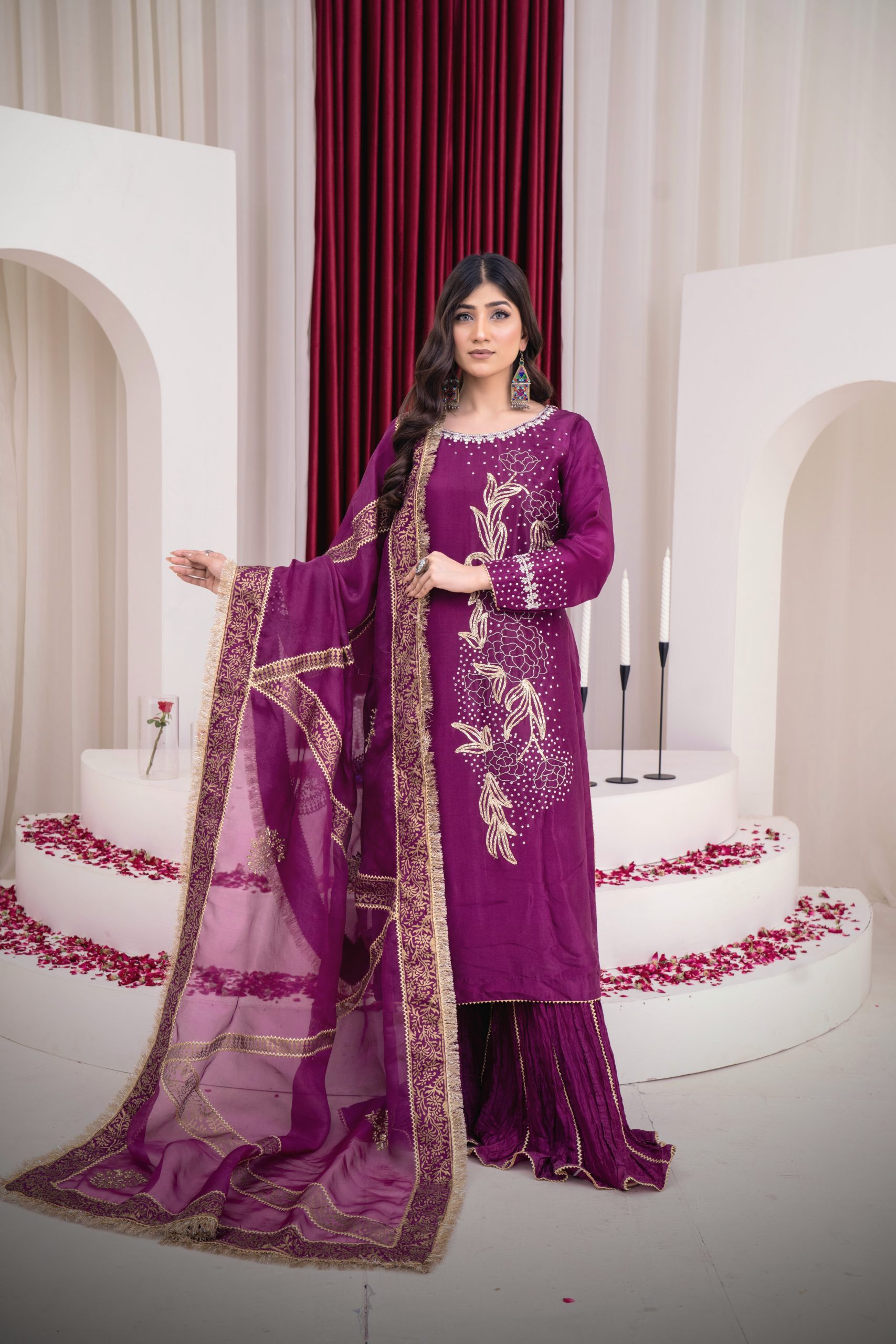 This elegant three-piece suit is perfect for a special occasion. The deep magenta-colored dress features intricate gold hand embroidery with a floral-inspired design and delicate embellishments. The sleeves are also detailed with matching embroidery. It is paired with crushed sharara in the same magenta hue. A beautiful magenta organza dupatta, adorned with a shimmering gold border and block paint, completes the ensemble